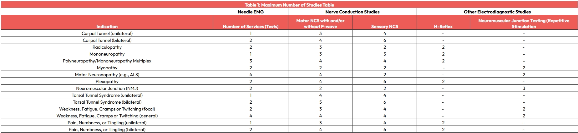 Each type of study (sensory, motor with or without F wave, H-reflex) for each nerve includes all orthodromic and antidromic impulses associated with that nerve and constitutes a distinct study when determining the number of studies in each grouping (eg, 1-2 or 3-4 nerve conduction studies).